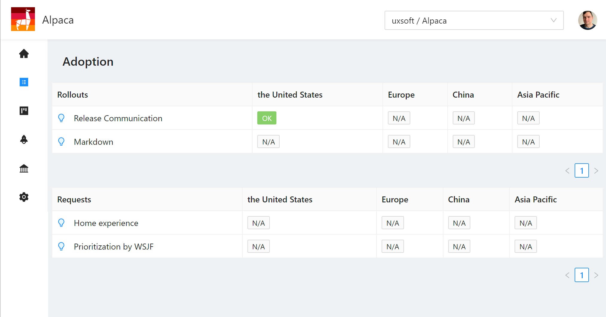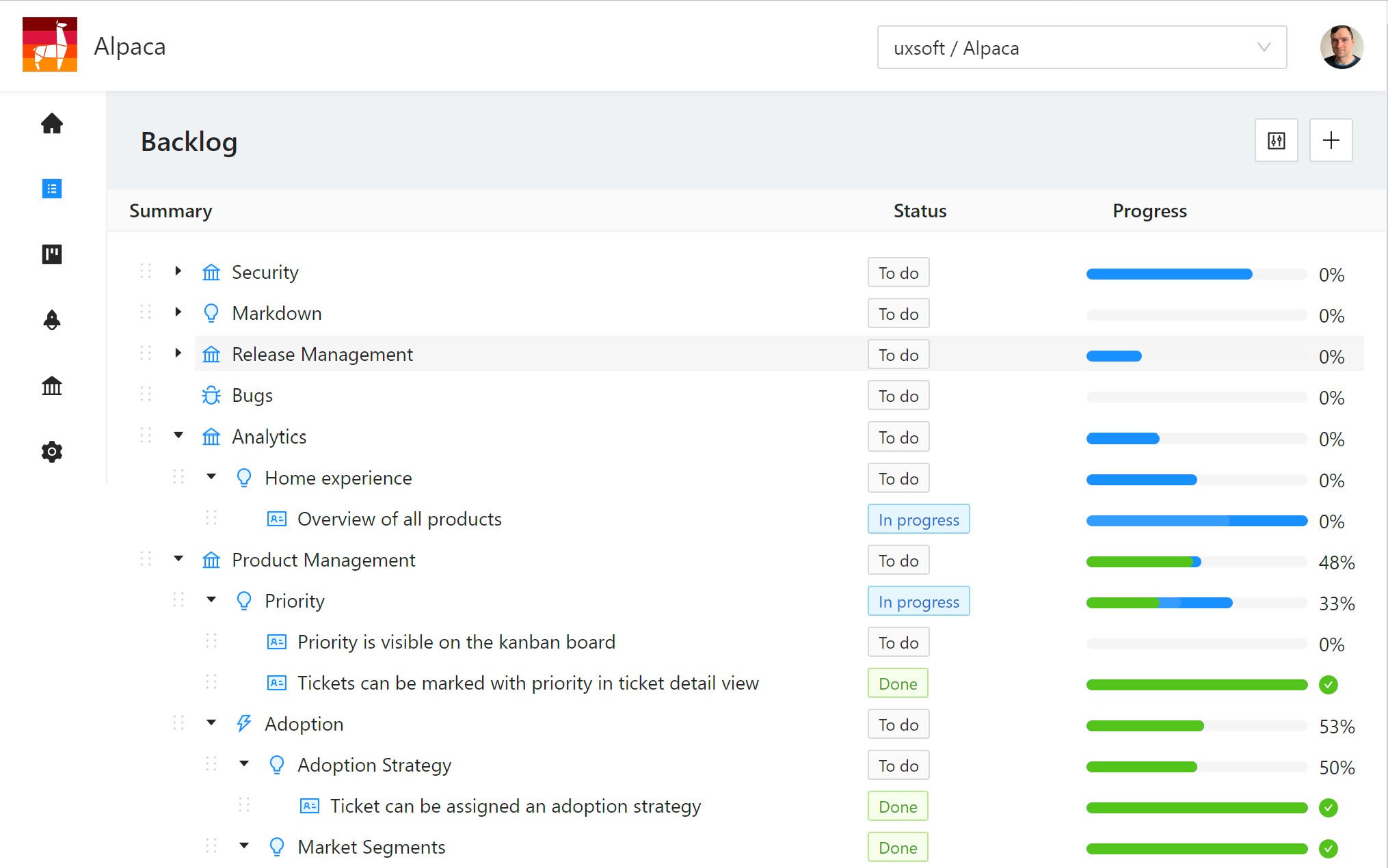 Alpaca is an all-in-one product development tool aimed at organisations applying agile at scale. It's an opinionated tool with built-in best practices from industry experts. The tool will softly guide you through the product development process end-to-end. Using Alpaca will make your work fun.